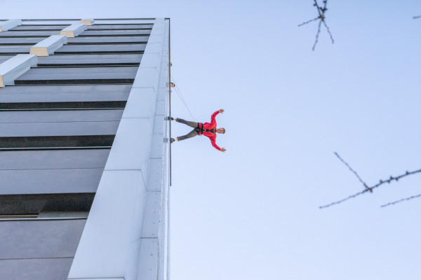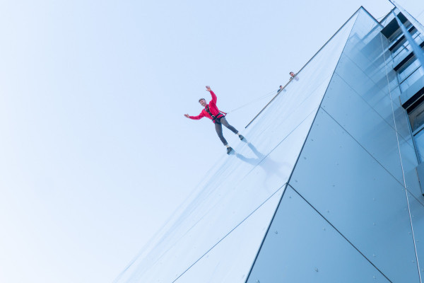 Beim House Running in München läufst Du, angeseilt an eine Spezialkonstruktion, aus 50 Metern die Hauswand des Rilano 24/7 Hotels in Schwabing runter. Den ersten Kick holst Du Dir beim über die Kante kippen, dann geht es senkrecht bergab.